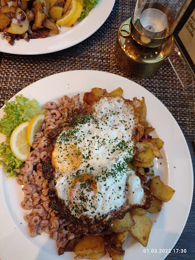 Nach weiteren 30min kam die Hauptspeise: -frittierte Muscheln mit Pommes und Remoulade für 14,99 € (schön knusprig) -drei Fischfilets mit Pommes und Remoulade für 18,90 € (Lachs, Rotbarsch, Scholle, grätenfrei und gut gebraten) -kleiner Beilagensalat