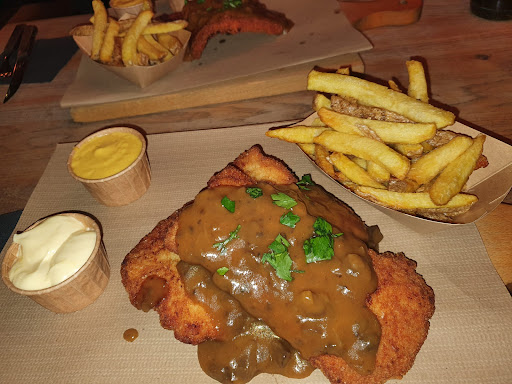 Waren mit 3 Personen am Sonntag Abend dort eingekehrt. Wir bestellten 2 x Rahm Schnitzel mit kleinen Pommes sowie Mayonnaise und Jopie Soße. ( je 2€ pro kleine Portion Soße 😳) Sowie ein Nacho Burger mit kleinen Pommes und Softdrinks.