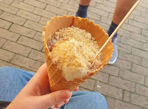Read moreWir hatten zuvor bei der Meierei auf Norderney einen Becher Frieseneis (Sorte: Friesischer Joghurt) gegessen und waren so begeistert, dass wir am nächsten Tag hierher kamen. Leider wurden wir etwas enttäuscht: Wir hatten uns vorgestellt, hier eine Eisdiele mit den verschiedenen Frieseneis-Sorten vorzufinden, in der man das Eis als Kugeln bestellen und sich Waffeln/Becher mit den verschiedenen Sorten zusammenzustellen kann. Jedoch kann man sich hier lediglich eine Eissorte aussuchen und diese im süßen Brötchen/Waffel/Becher bekommen. Darüber gibt es verschiedene Saucen (bspw. gesalzenes Karamell oder Erdbeerpüree) und on-top noch Kekskrümel oder Baiserstücke. Man bezahlt grundsätzlich 3,50€ für Waffel oder Becher und 4,50€ für das süße Brötchen - unabhängig davon, ob man zwei Toppings nimmt oder nicht. Die Eiskugeln plus Toopings sind aber wirklich großzügig. Leider verfälschen die Toppings den Geschmack des Frieseneis, welches wir doch so gerne mochten. Zudem sorgten die Kekskrümel zusammen mit gesalzenem Karamell und Vanilleeis für eine ziemlich trockene Angelegenheit, die nicht besonders gut schmeckte. Das Personal war aber sehr freundlich, wir durften sogar kleine Löffel von Eissorten ohne Probleme probieren.