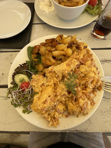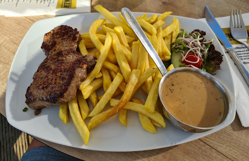 Die Mädels von der Bedienung waren reinlich, flink, geschickt, lustig und sehr nett. Wir hatten angemessen Zeit zum Kartewälzen. Die Getränke kamen prompt gebracht. Die Auslieferung erfolgte von separatem Personal. Das Kind isst sehr gern Pommes und braucht dafür eine Kleinwagenmenge voll Majonaise. Sie bestellt also immer mit extra Majonaise. Das hat hier zum allerersten Mal unserer Majomisere funktioniert. Es blieb sogar noch etwas übrig. Das Kind war somit bei unserem Besuch sehr, sehr glücklich. Ich hatte Bratkartoffeln mit Spiegeleier und Gewürzgurken. Angerichtet waren diese mit einer kleinen Salatgarnitur. Die Bratis waren etwas zu fettig aber gut. Der Mann aß einen Cheeseburger vom Angusrind mit Pommes und Salatgarnitur. Er hat die Pommes nicht geschafft, war aber um so begeisterter vom Burger. Wir können das Lokal empfehlen. Nicht nur wegen des Essens, sondern auch wegen der großartigen Aussicht auf das Meer. Wir würden...