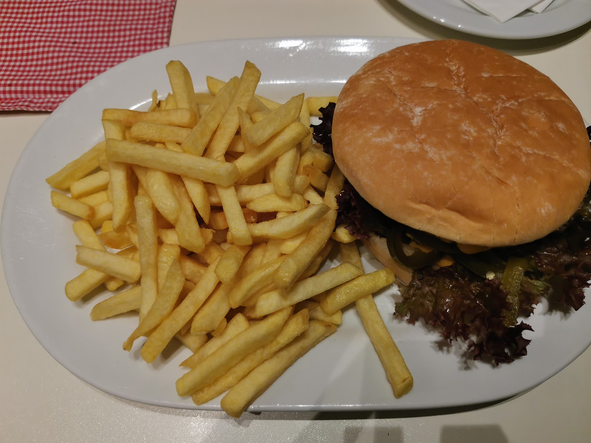 Obwohl der Preis fĂŒr das MenĂŒ an sich angemessen erscheint, kann ich beim besten Willen nicht ĂŒber die enttĂ€uschende QualitĂ€t des Essens hinwegsehen. Die Pommes waren zwar gesalzen, aber ansonsten ungewĂŒrzt und boten keinen Ausgleich zur EnttĂ€uschung, die der Burger darstellte.