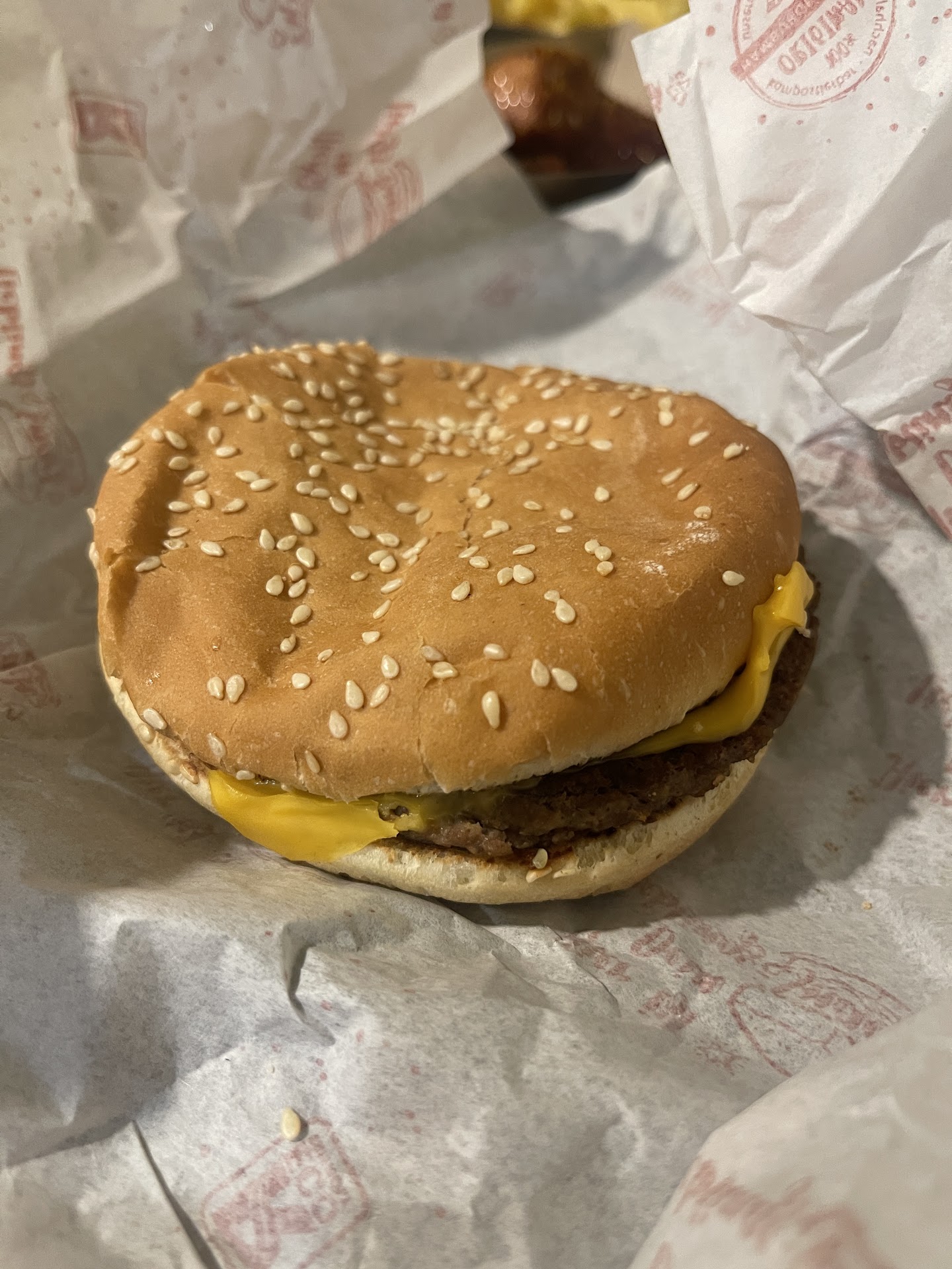 Für 8,10€ erhielt ich ein Menü, das neben dem Getränk und einer Portion Pommes, einen Cheeseburger umfasste, der jedoch jegliche Erwartungen enttäuschte. Der Burger war ein trauriges, zusammengedrücktes Etwas. Der Patty schien mit dem Käse und dem Brötchen zu einer einzigen Masse verschmolzen zu sein, sehr ähnlich dem, was man von Mikrowellenburgern kennt. Lediglich die Soße, Gurken und Zwiebeln machten den Anschein, als seien sie separat hinzugefügt worden, doch auch diese Zutaten schienen miterhitzt worden zu sein, was die Mikrowellentheorie nur bestätigt.