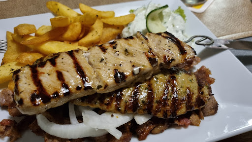 Essen: Wir hatten das Knobi-Brot, ein mal extra Tzaziki zur Vorspeise. Den Salat durfte man sich selber am der Salatbar herrichten, was mir persönlich gefallen hat. Für Leute die spezielle Sachen nicht mögen oder bezüglich Kalorien gerne das Dressing weglassen, war dies super. Zum Hauptgang hatten wir den Mykonos Teller und Überbackenes Gyros mit hauseigener Soße. Die Filets waren sehr schmackhaft, allerdings lies das Gyros etwas zu wünschen übrig. Ursächlich waren hierfür die vielen Fettstückchen im Gyros sowie das leider übersalzene Gyros (Überbacken) meiner Partnerin. Selbst ich musste dies feststellen, auch wenn ich mit Überwürzung in der Regel keine Probleme habe. Dadurch musste gut 3/4 des Gerichts auf dem Teller verbleiben, da anscheinend die Hauseigene Soße die Ursache war, welche über das ganze Gericht verteilt war.
