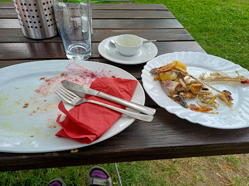 Das eigentlich Nebensächliche mal vorneweg: hier wird am Tisch bedient- herrlich, fast bin ich versucht zu sagen: wie früher- seufz! Man nimmt Platz, mit schöner Aussicht auf den See und ein dienstbarer Geist erscheint mit der Speisekarte. Bestellen, Relaxen, Getränke kommen, Essen kommt, Genießen- so ein wohltuender Kontrast zu der umsichgreifenden Epedemie der " freundlichen Selbstbedienung ". Da gebe ich gerne Trinkgeld- zumal die Servicedamen im besten Sinne alte Schule sind, inkl der ernstgemeinten Frage nach der Zufriedenheit des Gastes. Nun aber zum Wesentlichen: das Essen. Märäne mit köstlicher knuspriger Haut ( sauber geschuppt, nicht stört den Genuss) saftiges Fleisch und zusätzlich zum ganzen Fisch noch ein halber- da wird wohl wirklich jeder satt. Bratkartoffeln knuspriger geht's nicht- klasse. Die hausgemachte Remoulade und der kleine rote Bete Salat überzeugen ebenfalls- erstklassig. Die Fischsuppe vorweg war würzig und enthielt reichlich Fischstücke ( keine Gräten) die dazu gereichte Toastecke war knusprig getoastet und noch warm! Milchkaffee und 0,4 Wasser , am Ende noch ein doppelter Esspresso für 40 Euro - korrekter auch vom Preis. Etwa die Hälfte der Tische war besetzt, es gab keine lange Wartezeit. Alles super. So macht man Gäste satt...