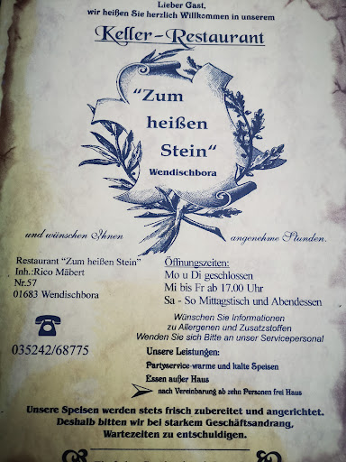 Erlebnisgastronomie in Wendischbora. Das Restaurant "Zum heißen Stein" befindet sich ein paar Meter seitlich an der B101 zwischen Nossen und Meißen. Für die Autofahrer gibt es genügend Parkplätze am Haus. Das Gebäude ist äusserlich recht unscheinbar aber innen scheinbar riesig.. So gibt es neben dem eigentlichen Restaurant im Keller des Hauses noch eine Bowlingbahn für 30 Gäaste , eine Bar und einen Gesellschaftsraum für 25 Gäste. Die Auswahl der Speisen und Getränke ist sehr üppig und reicht vom Fisch über Geflügel und Lamm bis zum zarten Rinderfilet und das was man sich bestellt ist von hervorragender Qualität und so portioniert, daß man gut gefüllt den Weg nach Hause antreten kann. Wie der Name des Restaurants schon sagt, kann man sich nach Wunsch seine Fisch-, Fleisch- oder Gemüsespeisen entweder fertig zubereiten lassen oder man übernimmt das braten oder garen mit hilfe eines heißen Lavasteines selbst. Mit dem besagten Lavastein den man zur Bestellung der Speisen dazu bekommt hat man keine Mühe , sein Essen so zuzubereiten wie man es mag. Der Stein gibt bis zu 40min lang Temperaturen zum garen ab, so dass man sich auch etwas Zeit lassen kann. Weitere Tipps stehen in der Menükarte auf der letzten Seite. Die Bedienung ist sehr freundlich , aufmerksam und schnell. Teilweise etwas zu schnell, sodass zum teil noch die Vorspeise auf dem Tisch steht, wenn der Hauptgang kommt. Aber vielleicht muss das so sein und gehöhrt zur Philosophie des Unternehmens. Im großen und ganzen kann man in der Gaststätte einen schönen Geselligen...