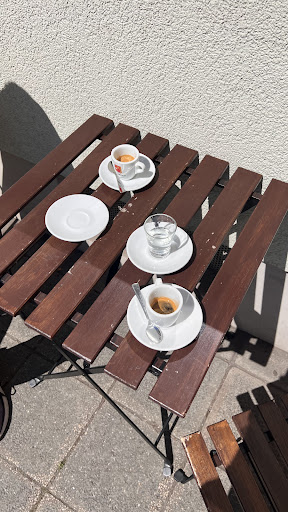 Wir haben einen Espresso getrunken – er war in Ordnung, besser als bei manchen großen Ketten, aber nichts Besonderes. Es gibt zwar Sitzgelegenheiten im Innenbereich, jedoch ist das Sitzen dort leider nicht erlaubt, sodass man nur draußen Platz nehmen kann. Dadurch gibt es nur Raum für zwei Gruppen.