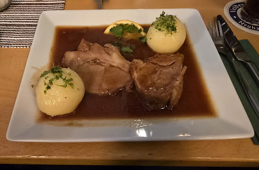 Die Gans war wohl recht lauwarm, wurde aber nicht an den Service weitergegeben-wir haben jedoch auch nicht probiert und uns somit auf die Aussage verlassen. Schaufel und Schweinebraten waren wirklich sehr lecker, die Soße gut deftig (für Salzreduzierte Esser nicht zu empfehlen😅) und auch mengenmäßig mehr als ausreichend. Allerdings bleibt es mir ein Rätsel, warum die Beilagen immer mehr reduziert werden: die Klöße sind von Tischtennisballgröße, dabei ist Kloßteig nicht unbedingt teuer und hier sollte, gerade in Bayern, nicht gespart werden. Lieber nur 600g Fleisch als 800g und stattdessen etwas mehr Beilage, da verdient der Wirt letztendlich auch mehr^^🤣