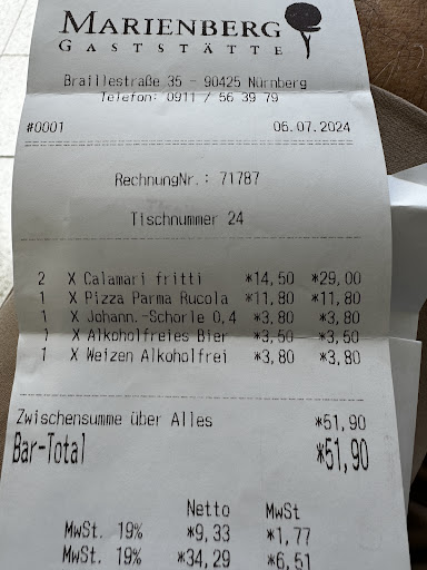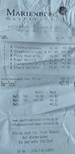 Read moreDie Gaststätte Marienberg hat den schönsten und ruhigsten Biergarten in der Region. Die Tische werden jeden Tag mit frischen Blumen geschmückt und die bequeme Bestuhlung lädt zum längeren Verweilen ein. Das angebotene Essen (deutsche und italienische Küche - Gabriele ist der Chef in der Küche) ist sehr reichhaltig und abwechslungsreich. Die Speisen und Gerichte werden täglich mit frischem und saisonalem Gemüse zubereitet und von der Chefin Sandra für jeden sichtbar auf Tafeln geschrieben. Wir freuen uns jedes mal, die verschiedenen Gerichte auszuprobieren. Es ist für jeden Geschmack etwas dabei und besondere Wünsche werden selbstverständlich berücksichtigt. Sandra zaubert mit ihrer liebevollen aber auch professionellen Art die Gäste zu bedienen, Jedem ein Lächeln ins Gesicht. Wir können das Lokal bestens empfehlen und freuen uns jedesmal wenn wir dort zum Essen sind oder nach der Gassirunde auch nur ein Bier genießen. Gerlinde Hatke und...