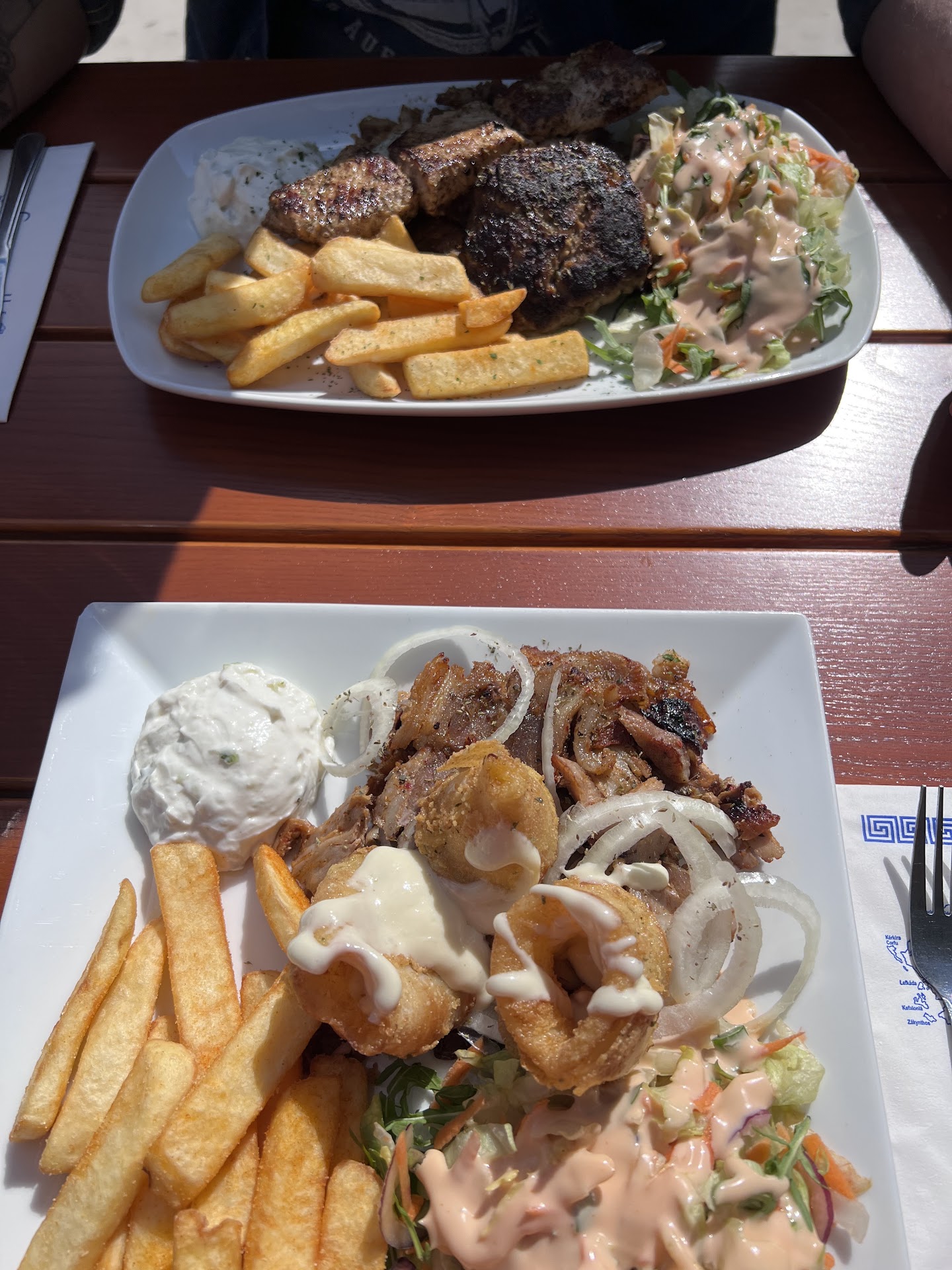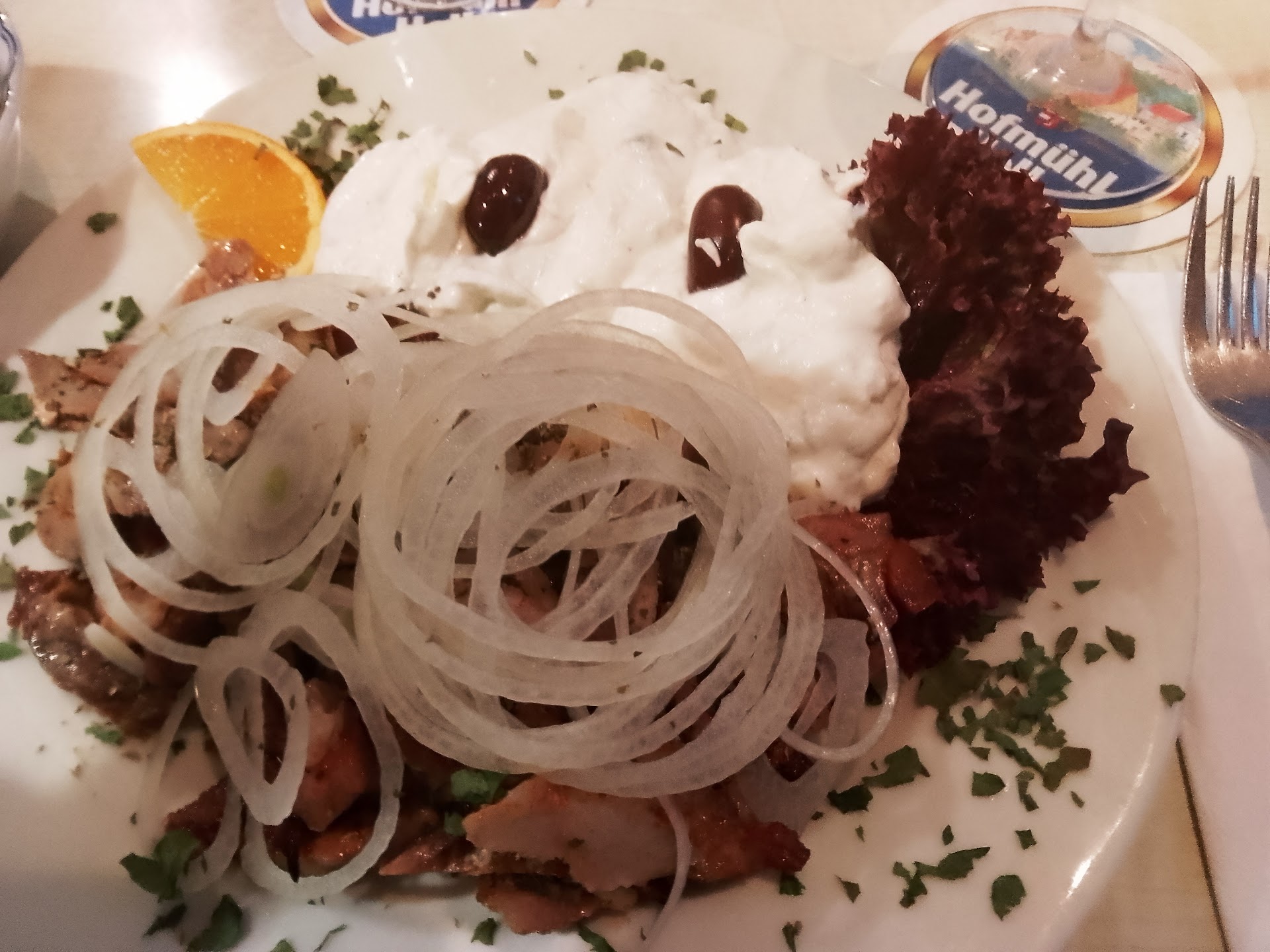 Wir saßen draußen im Biergarten der eigentlich sehr schön ist. Die Sauberkeit allerdings ließ auch hier zu wünschen übrig. Auf den Tischen lagen dreckige Plastik Decken und die Sitzkissem waren voller Stockflecken.