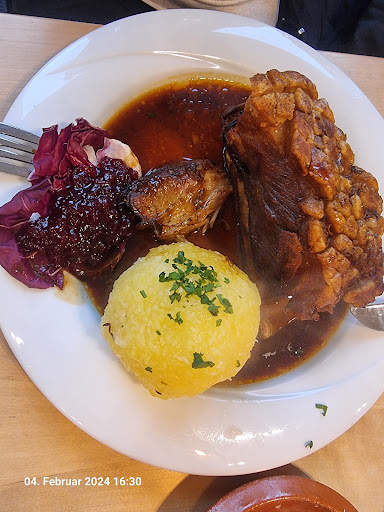 Zum essen Feldsalat super keine Mangos Kloß mit Schäuferle super vorallem Die Preiselbeeren Soße dazu. Entenschenkel mit kloß fand ich jetzt Ok aber habe schon bessere gegessen. Haut nicht knusprig und das Fleisch zu zäh.( hätte man länger im Ofen lassen können )