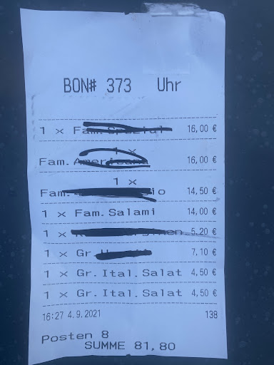 Read moreHeute war ich wirklich mehr als geschockt. Die Dame am Telefon beim bestellen war wirklich sehr nett. Hatte 1 Familienpizza mit Salami, Champignons, Knoblauch OHNE Käse bestellt. Als ich diese abholen wollte hab ich auf der Rechnung gesehen dass die Pizza mit Salami, Schinken und Knoblauch belegt wurde und hab den Mann drauf hingewiesen und gesagt dass das nicht weiter schlimm ist und dann kam nur als Antwort „achso“ Wie die Pizza fertig war hab ich gesehen dass die Pizza mit Käse gemacht wurde.. Da ich Käse nicht vertrage musste ich diese leider zurück geben und eine ohne Käse „verlangen“. Einer der beiden Männer (der jüngere mit Brille) war extrem freundlich und hat die Situation total mit Humor genommen und der andere total komisch und grimmig..