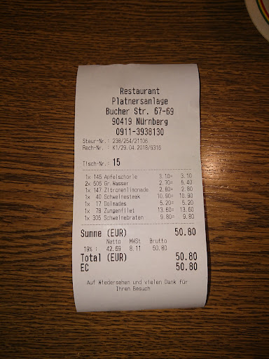 Wir besuchen die Platnersanlage nun schon seit vielen Jahren immer wieder und konnten bisher noch keine Erfahrung machen, dass wir hier nicht mehr hingehen sollten. Obwohl wir bisher immer ohne Reservierung kamen, konnte uns bis auf ein einziges mal auch bei gut besuchter Gaststätte kein Platz angeboten werden. Der Service ließ nie lange auf sich warten. Wir hatten eigentlich nahezu unabhängig von der Auslastung immer gleiche Zeiten des Service, was für uns für das Lokal spricht. Nach der Begrüßung und dem Reichen der Karte sind die bestellten Getränke zügig am Platz und nie abgestanden. Die Speisekarte ist in unseren Augen sehr gesellschafts- und familienfreundlich ausgelegt, da hier aus unserem Umfeld jeder etwas findet, die vegetarische Komponente, ist wie in unserem Umfeld auch, nicht stark ausgeprägt (Aber hier ein Tipp: Speisekarte vor dem Betreten lesen, und draußen bleiben.) Die Zeit bis zur Lieferung der bestellten Speisen ist angemessen, und die Qualität gab noch nie Grund zur Kritik. Während des Essens wird immer wieder höflich nachgefragt, ob alles in Ordnung sei, jedoch ohne dabei aufdringlich zu wirken. Trotz hoher Auslastung und neuen möglichen Gästen, wurden wir noch zur Zahlung gedrängt, sondern neue Anfragen kurzerhand vertröstet. Die Außenanlage ist aufgrund der Lage an der Straße etwas lauter, aber dass ist wohl der Preis der guten Erreichbarkeit. Vereinzelte Schädlinge auf den Pflanzen sind mir lieber als der übermäßige Einsatz von Pflanzenschutzmitteln, welche so auch in mein Essen kommen könnten, da nehme ich lieber eine extra Portion Protein anstatt Chemie. Ein von manch anderem hier beschriebener unaufgeräumter Zustand des Aussenbereichs oder ein abgenutzter Innenbereich, kann zwar unter Umständen auch von uns bestätigt werden, jedoch ahnden wir dies nicht negativ. Im Gegenteil wir deuten dies als sukzessiven Wandel in der Einrichtung, welcher durch die Betreiber selber unternommen wird, anstatt in einer Hau-Ruck-Aktion alles umzubauen, und dabei viel Geld in die Hand zu nehmen. Alles in allem also ein durchdachtes Konzept, welches von seinen höflichen Mitarbeitern und guten Speisen zu sehr fairen...
