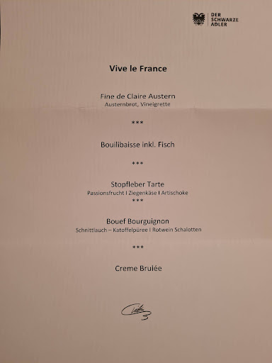 Read moreHeute wurde ich überraschend in den Schwarzen Adler eingeladen. Schönes, angenehmes Ambiente, freundliches Personal und sensationelles Essen, experimentierfreudig aber stimmig. Wer etwas besonderes mit regionalen Produkten sucht ist hier gut aufgehoben. Ausführliche Beschreibung folgt. Sehr netter Empfang im Lokal. Das Lokal selbst hat eine edel-rustikale Einrichtung, passend zu dem alten Gebäude. Es immer einige Tische belegt. Wir wurden sehr gut beim Menü beraten. Zur Einstimmung bekamen wir selbst gebackenes Brot und selbst gemachte Butter mit Meersalz. Dann wurde die Kabeljau-Haut serviert, um die geringe Wartezeit zu verkürzen. Die Weinbegleitung war fachkundig ausgewählt. Mein erster Gang war eine sehr zarte Jakobsmuschel, mit den ideenreich angerichteten Blumenkohlvarianten. Der Rehrücken war weich, Rotkohljus und Sellerie (auch in Varianten) perfekt abgeschmeckt. Dazwischen wurde ein AnanasSorbet mit gerösteten Oliven und Olivenöl gereicht. Tolle Oliven, paste hervorragend zusammen. Der Kaiserschmarrn aber mehr eine Tarte, super saftig und die Kruste karamellisiert.