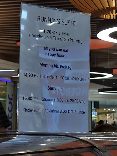 Read moreIch war gestern mit meinem Sohn (9) Jahre alt dort mittags essen. Als wir ankamen, fragte ich, wie das mit dem Running Sushi läuft. Sie sagte mir, es kostet 17,90. dann fragte sie meinen Sohn, wie alt er sei. Mein Sohn antwortete „ Ich bin fast zehn.“ (Er freut sich auf seinen Geburtstag in einem Monat). Ich dachte mir nichts weiter. Während des Essens sah ich ein Schild, auf dem Stand, dass Kinder unter zehn Jahren 9,90 € für das Running Sushi bezahlen. Und ein anderes auf dem Stand, man könne auch Tellerweise (zwei Euro pro Teller) essen. Beides hat uns vorher niemand gesagt. Als sie mir die Rechnung hin legte, wurde zweimal 17,90 abgerechnet. Ich sprach an, dass mein Sohn ja noch keine zehn Jahre alt sei, so habe er ja auch geantwortet. Er ist fast zehn. Die Dame reagierte sehr unfreundlich und meinte, dass sie das jetzt nicht mehr ändern könne und wir ihr beim nächsten Mal den günstigeren Preis zahlen könnten. Ich sagte, dass ich damit eigentlich nicht einverstanden sei, da mein Sohn nun mal noch 9 Jahre ist und wir daher den besagten Preis für Kinder zahlen möchten. Ich wurde dann gefragt, ob ich einen Ausweis von ihm dabei habe. Natürlich trage ich nicht den Kinderreisepass mit mir herum. Somit war das für die Dame erledigt und wir haben einfach zweimal den vollen Preis zahlen müssen. Nebenbei bemerkt war das Sushi von der Qualität her nicht gut. Der Fisch war teils trocken, die - eigentlich mit Teig - frittierte Garnele war auch noch in ihrer Schale, so dass ich beim Essen den Mund voller Schale hatte. Damit rechnet man ja auch nicht, wenn man eine frittierte Garnelen isst. Die Krabbenchips haben nach altem Öl (Eventuell sogar schon ranzig, da bin ich mir nicht ganz sicher) geschmeckt. So viel Unfreundlichkeit habe ich in der Gastronomie selten erlebt. Wir werden hier sicherlich...
