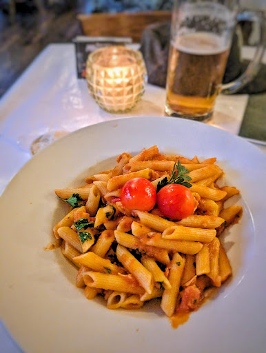 Der Service war perfekt. Äußerst freundlich, aufmerksam und professionell. Meine Penne all'arrabiata waren ein echtes Highlight! Wirklich perfekt al dente, die Soße hatte genau die richtige Balance zwischen Fruchtigkeit und Schärfe, und der gebratene Speck und die frischen Chilis runden das Ganze perfekt ab. Genau so muss für mich eine Arrabiata schmecken! Die Portion war überdurchschnittlich groß und vom Preis hätte man auch locker noch ein paar Euro mehr verlangen können, das ist wirklich mehr als preiswert.
