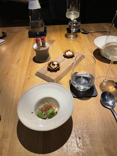 Read moreFusion or better Confusion. I intended to take out my wife on a treat to a Michelin starred restaurant in my home town Nürnberg, but this was a let-down. There are so many great fine dining restaurants in Germany and Europe, but I can't count Veles as one of those. No real flavour concept or at least none that we understood, average service, I presume they were mentally on vacation already (restaurant closed the next day), and significantly overpriced for what it was. EUR 40 difference between the 5- and the 7-course menu and I regret to have chosen the 7-course. The two additional courses were just two tiny desserts and one of them was a very strange blue cheese granita. Wine list consist of plenty of natural wine. If you have tasted natural wine before, then you know what I am talking about. Chef didn't bother to explain the dishes. If you keen on trying local food, there are many better and cheaper options out there in Nürnberg. If you are into fine dining, save the money, hop on a plane to London and go to restaurants like Andrew Edmonds (no star, great food and stunning wine list) or Clove Club (2-star, top food,...