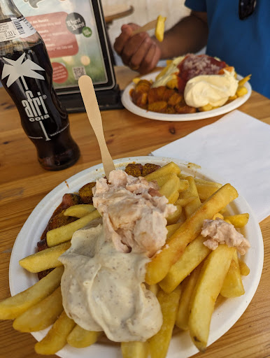 Ich bestellte Currywurst (Rot) mit Pommes und dazu ein Wasser. Über die Pommes bestellte ich Pflaumen Ketschup und Majonäse mit Honig und noch etwas angerührt. Dafür zahlte ich 7 Euro. Serviert wurde das ganze Stilecht auf einem Pappteller mit Holzgabel. Die Wurst war sehr gut, die Pommes heiß, kross, gesalzen und schmeckten super.