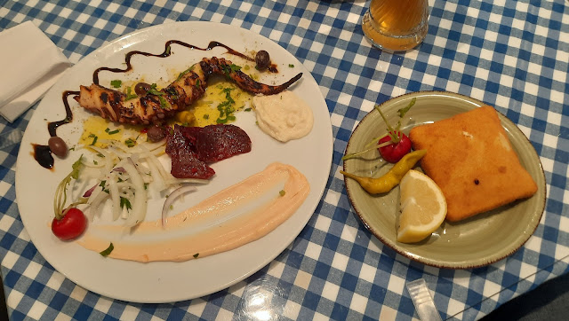 Auf Empfehlung unseres Sohnes besuchten wir nach telefonischer Reservierung das unauffällige Lokal. Wir sind zweimal dran vorbeigelaufen, weil es so unscheinbar in die Häuserfront integriert ist. Service, Personal und die Qualität der Speisen und Getränke sind einfach super und absolut preiswert. Ein Geheimtipp! Seitdem sind wir hier Stammgäste. Man schmeckt, dass hier alles frisch zubereitet wird. Sehr viele Griechen sind hier auch Stammgäste- die wissen schon, weshalb. Ich empfehle, auch unter der Woche, vorher telefonisch zu reservieren. Was uns als Hundebesitzer besonders freut: sie sind hier herzlichst willkommen. Wasser (für unsere Hunde) wird sofort vom Personal gebracht, nicht erst auf Nachfrage. Auch die Nachtischauswahl ist riesig, da haben wir leider noch nicht alle durchprobiert. Was wir aber bereits probiert haben, war alles lecker. Auch die Essensportionen, und ich bin wirklich ein guter Esser, sind kaum zu schaffen. Alles in allem ein gemütliches Lokal, welches man ruhigen Gewissens in allen Punkten weiterempfehlen kann. Tipp ans Personal und den Koch: nichts verändern, weiter so bitte! Das eine Bild zeigt übrigens die leckeren Shrimps mit Nudeln, die ich sehr empfehlen kann. Auf dem anderen Bild sieht man "Xtapodi Grill"- das war ein sehr leckerer Tintenfischtentakel, daneben der knackige Saganaki. Auch das gegrillte Bifteki samt Beilagen war überaus lecker. Die Nachtische müssen wir uns jedes Mal auf´s Neue erklären lassen. Es war aber immer wie versprochen- einfach...