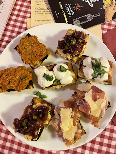 Read moreÜberraschung! Das Äußere, speziell der vorgelagerte Innehof, kann mit Leichtigkeit verbergen, welche kulinarischen Glanzlichter im Inneren zu finden sind. Neben den, allesamt top zubereiteten Klassikern, wie Pizza und Pasta, sind es aber die kleinen Dinge, die das Caputo so besonders machen. Die Rumpsteakstreifen, ganz dünn geschnitten und leicht scharf, mit gestoßenem Pfeffer gewürzt, auf dem Salat...toll! Ein Parmesancreme-Burger...beim Italiener! Aber, geschmacklich der Hammer! Und so geht es weiter... Dazu immer wieder neue Ideen die überraschen. Eine große Auswahl an Gin, für Liebhaber und Experimentierfreudige ein Paradies. Netter Service und "Der Pate" und sein Junior tun ihr Bestes, um ihre Fangemeinde weiter zu vergrößern. Und, nach der Pflicht kommt die Kür, auch noch ein Espresso, so wie er sein soll! Dazu passt das Zitat von Charles-Maurice de Talleyrand-Périgord: „Der Kaffee muss schwarz sein wie der Teufel, heiß wie die Hölle, rein wie ein Engel und süß wie die Liebe.“ Wir...
