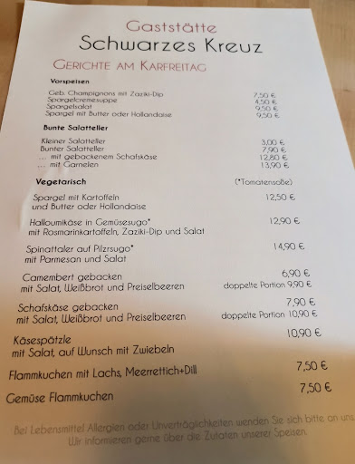Read moreWir hatten einen Tisch am Karfreitag im Schwarzen Kreuz um 13:30 Uhr reserviert. Der Empfang hätte nicht kühler und abfälliger sein können. Die negativen Bewertungen anderer Gäste haben ihre Berechtigung. Man fühlte sich definitiv nicht willkommen! Der Tisch hätte auch vor unserem Besuch abgewischt werden sollen, sodass dieser nicht klebrig ist. Da wir die späteste "Schicht" am Karfreitag waren, waren wir verwundert über die sehr langen Wartezeiten (Aufnahme und Servieren der Getränke und Gerichte sowie Abkassieren). Da auf der Internetseite nichts gegenteiliges stand, waren wir davon ausgegangen, dass es eine etwas größere Auswahl an vegetarischen Gerichten und auch Fleisch gibt. Auf unsere Nachfrage haben wir ein verächtliches "am Karfreitag gibt's kein Fleisch!" als Antwort bekommen und die Bedienung ist auch einfach gegangen. Der Ton macht hier die Musik und wir drei fanden so ein Auftreten äußerst unangebracht. Die Käsespätzle waren sehr fettig, aber OK. Der Spargel mit Kartoffeln war auch nur durchschnittlich. Meine Partnerin hatte allerdings das große Los gezogen und sich für ein Pilzgericht entschieden. Diese waren leider (auch durch uns andere getestet) furchtbar schleimig und so nicht essbar. Die zugehörigen Spinattaler haben leider nach nichts geschmeckt. Zufälligerweise erkundigte sich später eine andere Bedienung bei uns nach dem Wohlbefinden und ging auch sofort auf unsere geäußerte Kritik ein und bot ein anderes Ersatzgericht an, was stattdessen berechnet wurde. Auch zum Abkassieren mussten wir uns selbst bemerkbar machen und das Personal in der Küche aufsuchen. Die Sanitäranlagen sind in die Jahre gekommen, aber sauber. Dennoch hat das Auftreten der ersten Bedienung (Chefin?) uns gereicht, weshalb wir dieses Restaurant nicht weiterempfehlen und nicht mehr...