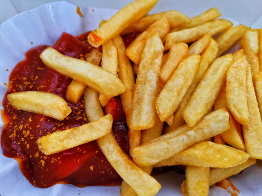 Hier bekommt man auf die schnelle eine leckere Currywurst to go oder aber auch zum Verzehr vor Ort an Bistrotischen.