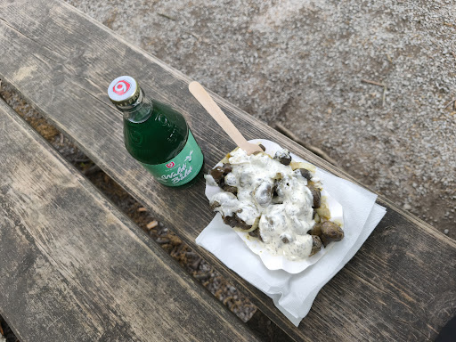 Bestellung: Pommes mit Ketchup + Mayo und Eis. Ketchup und Mayo gabs dann draußen, Selbstbedienung. Kostet 60 Cent, konnte sich aber auch so jeder nehmen. Nicht lecker, besonders bei der Masse an Menschen.