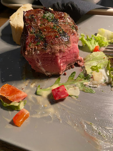 Wir waren am Valentinstag dort essen. Als wir ankamen, war unser Tisch noch besetzt. Zusammen mit 3 anderen Paaren mussten wir warten. Als Entschuldigung gab es ein Glas Prosecco aufs Haus. Das zuletzt erschienene Paar wurde als erstes zu einem Tisch gebracht. Das geht nicht, weil wir alle gewartet haben und man die ersten zuerst nehmen sollte. Nachdem wir die Karten hatten, kam 20 Minuten keiner um die Bestellung für Getränke und das Essen entgegenzunehmen. Wir haben dann selbst einen Kellner herbeigerufen. Dieser hat auf einem Notizblock die Bestellung notiert. Scheinbar so unsauber, dass er später selbst nicht mehr lesen konnte, welchen Garzustand das Filet haben sollte. Dazu später mehr. Die Vorspeise wurde nicht gebracht, stattdessen direkt der Hauptgang. Auf meine Nachfrage, wo denn die Vorspeise bliebe, wurde ich gefragt ob ich sie stornieren oder trotzdem noch haben will. Man bot uns an, dass unser 45€ Filet warm gehalten werden würde, wenn wir erst die Vorspeise essen wollen, die uns dann noch gebracht wird. Ich gehe nicht ein 45€ Filet essen, wenn es statt frisch, warm gehalten serviert wird. Das war schon frech, zumal es der Fehler des Kellners war die Vorspeise nicht zu bringen. Die Pommes wurden in altem Fett gebraten, was an der Farbe zu erkennen war und sie waren viel zu kross, sodass man sie mit der Gabel nicht aufspießen konnte. Die Steakmesser wurden erst gebracht, nachdem bereits die Hälfte des Fleisches gegessen wurde. Das Filet war geschmacklich lecker und gut gewürzt mit Salz und Pfeffer. Mein Freund hatte mit seinem Filet weniger Glück. Er bestellte es „medium well“ und er erhielt es in einem Zustand zwischen „Blue und rare“, also ziemlich roh. Am Nachbartisch wurde der gewünschte Garzustand der Dame auch nicht erreicht und sie musste es reklamieren. Auch mein Freund hat das Filet dann reklamiert. Daraufhin bekam ein angeblich ein neues Stück Fleisch. Es wurde jedoch anders zubereitet und nicht gegrillt, sondern im Ofen gemacht. Der Teller war heiss und stand auf einer Holzplatte. Auf dem Teller schwomm das Filet in Öl. Geschmacklich war es bei weitem nicht so wie ein gegrilltes Filet. Die neue Grillkartoffel war viel zu lange angebraten und dadurch trocken. Der Service kam nie, um zu fragen, ob wir Nachtisch oder noch Getränke möchten. Als wir die Rechnung verlangten, fragte der Kellner ob alles in Ordnung gewesen sei. Wie schilderten ihm, was alles schief gelaufen ist und dass wir leider enttäuscht sind. Von einem Steakhaus sind wir anderes gewohnt. Wir fragten, ob man uns aufgrund der Fehler des Restaurants entgegenkommen kann und ein Nachlass kam nicht in Frage, weil der Bon angeblich nicht geändert werden kann. Es muss immer eine solche Möglichkeit geben, falls z.B. mal was falsches auf einer Rechnung landet, was nicht bestellt wurde. Laut dem Kellner lief alles nur so schlecht, weil so viel los war. Ein gutes Restaurant zeichnet sich dadurch aus, dass es mit Stress umgehen kann und die Qualität nicht darunter leidet. Es wird auch an anderen Tagen viel los sein und dann muss man den Andrang bewältigen können. Hier besteht dringend Schulungsbedarf des Personals.
