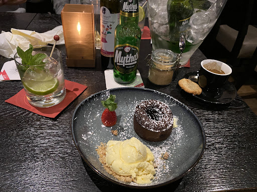 Read moreEin absolut tolles Erlebnis in Oberhausen. Einmal nicht der typische Grieche, wie man ihn häufig erlebt. Eine nette Begrüßung und ein klasse Tisch im vorderen Bereich. Trotz des sehr gut gefüllten Ladenlokals blieb die Aufmerksamkeit der äußerst freundlichen Bedienungen bestehen, welche den Getränkenachschub flott organisierten. Die Bestellung der Speisen konnten in einem kurzen angemessenen Wartezeitraum getätigt werden. Der sehr nette Chef des Lokales names Georgios hat auch interessante Kompositionen angeboten, falls man sich mit der Wahl seines Gerichtes nicht direkt sicher war. Als Amuse-Gueule gab es zu den Oliven noch ein noch frisches Brot und ein paar Pitas und 3 verschiedene Aufstriche. Der eine war mit Käse angemacht und ein anderer war eine selbstgemachte Olivenpaste. Der dritte war der übliche Zaziki (ohne zu Übertreiben, „für mich“ der beste den ich je gegessen habe). Die Vorspeise bestand aus ein paar griechischen Meze. Ein wenig Lammfilet in Knoblauch, oder Garnelen in Knoblauch und leckeren Zuchini in Bierteig mit Honig. Als Hauptgericht gab es an dem Abend einen lecker angerichteten Gyros (sehr mager und nicht zu fett und leicht kross😋) mit selbst gemachten Pommes auf einer mini Palette. (Tolle Idee übrigens )👍 Als Nachtisch kam die Krönung, ein flüssig-Kern Schokoladen Soufflé mit Vanilleeis. Unfassbar Gut!!! Was man auch mal gerne probieren muss, ist das griechische Bier namens Mythos. Ist halt ein nicht so herbes Bier und echt lecker. Wurde auch sehr dekorativ in einem durchsichtigen mit Eis gefüllten Weinkühler gereicht. Echt super und immer wieder gerne hin. Demnächst auch mal mit ner Flasche Wein. Einen guten Appetit an alle die es...