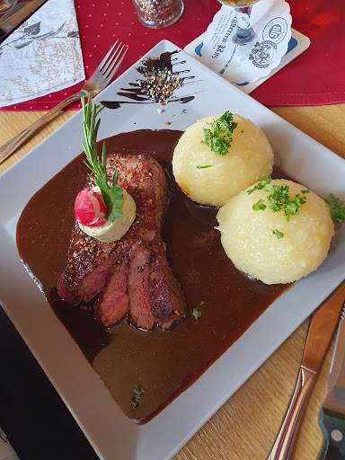 Das Fleisch war so zart, das es auf der Zunge zerfiel. Die Klöße weich und dennoch fest, gefüllt mit in Butter geschwenkten Bröseln - ein Gedicht! Die tiefdunkelen Soßen kräftig und zugleich aber auch blumig dezent.