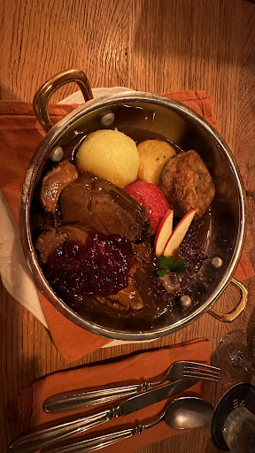 Wir haben uns für Wildbraten mit einer Variation von Klößen entschieden, für satte 29 Euro. Es wurden vier Klöße in einem Edelstahlnapf serviert, was ich persönlich weder schön noch stylisch finde! Das erinnert mich eher an einen „Knasttopf“ oder Futternapf und ist unpraktisch zum Essen.
