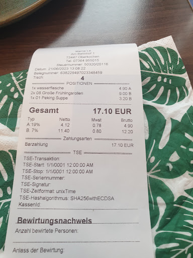Read moreIch habe Essen zum Mitnehmen bestellt. Obwohl das Essen insgesamt noch nicht fertig war, als ich es abholen wollte, waren sowohl die Frühlingsrollen als auch die Ente zu Hause kalt (Fahrtweg ca. 1 Minute). Dann noch die böse Überraschung: Eines der Essen war das falsche. Wie man die zwei Nummern am Telefon verwechseln konnte, ist mir unklar. Dieses Gericht hat mir leider nicht wirklich geschmeckt, ich war aber natürlich auf etwas anderes eingestellt. Insgesamt lässt sich sagen: Wenn alles richtig und warm zu Hause ankommt, ist alles essbar, aber kein Highlight. Zu viel Reis im Verhältnis zu Gemüse/Sauce, preislich eher teuer. Personal beim Abholen auch nicht...