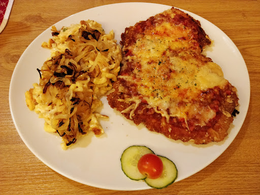 Looking for a decent and nice big schnitzel, I came upon this place, quite close to home. From the pictures on Google Maps these Schnitzel look good to feed a hungry man, and they did. I got the Milano one, with tomato sauce and cheese on top. The Schnitzels are hand made, so that's a enormous plus. Instead of fries we were able to have käsespätzle, which tasted good as well and something different. It took quite a long time to be served, which I found a bit strange because it wasn't that crowded. I really like the waitress thought, a good...