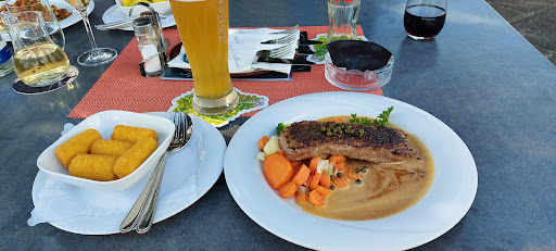 Read moreAlso die Positiven Dinge zuerst: Das Ambiente sowie die Aussicht waren sehr schön. Die Bedienung war sehr freundlich und aufmerksam und das Essen ließ nicht lange auf sich warten. Leider endet die Liste der positiven Aspekte hier. Die minus Punkte starten leider schon bei der Ankunft, wenn man direkt genötigt wird sich die Hände zu desinfizieren, worüber man allerdings, aufgrund der aktuellen Situation, hinweg schauen kann. Aber das schlimmste von allem war das Essen. Angefangen damit, dass für jede Änderung am bestehenden Menü 1€ fällig wird. Als ob es für den Gastronom einen Unterschied macht ob man nun Pommes oder Kroketten zu seinem Steak möchte. Das habe ich vorher noch nie erlebt. Dann muss ich sagen, ist das Preis-Leistungs-Verhältnis unter aller Sau. Ich hatte das Putenfilet mit Kroketten für 17.90€ und bekam ca. 180g Fleisch mit 5 Kroketten. Das ist für diesen Preis viel zu wenig und satt wird davon auch keiner. Die kleinen Portionen, die zum Teil angegeben werden, würde ich wirklich meiden. Die Qualität des Essens war allenfalls mittelmäßig. Es hat auf keinen Fall schlecht geschmeckt, war aber qualitativ wie quantitativ eher auf dem Niveau einer Kantine. Weder die Kroketten noch die hoch angepriesene Sauce war hausgemacht, was man speziell bei den Kroketten deutlich geschmeckt hat. Tipp von mir: Wer Lust auf Kroketten hat soll zum örtlichen Rewe gehen und diese tiefgefroren kaufen, die sind qualitativ gleich aber man hat auf jeden Fall mehr für weniger Geld. Ich kann das Lokal jedenfalls nicht weiter empfehlen und war...