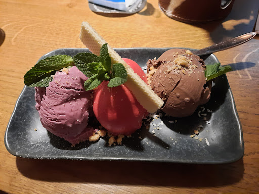 Langfassung: Die Onlinereservierung verlief problemlos und sicherte mir und meiner Familie auch kurzfristig noch Plätze in dem scheinbar – und zu Recht – gut besuchten Restaurant. Wir wurden sehr freundlich und zuvorkommend bedient, auf das Essen mussten wir auch nicht lange warten. Und was soll ich sagen: Es war tatsächlich die beste Ente, die ich je gegessen habe! Innen saftig und zart, außen eine knusprige, sehr schmackhaft gewürzte Haut. Dazu gab es Rotkraut und Kloß. Meine Frau, die auf Grillgemüsespieß mit Kartoffelchips und Dips auswich, war ebenfalls absolut zufrieden. Vom leckeren Dessert (gemischtes Eis) habe ich ein Bild mit angehängt. Wer auf Volksmusik steht, wird außerdem die Livemusik lieben. Unsere Kleine hat gern dazu getanzt. Das Restaurant verdient sich alle fünf Sterne durch hervorragendes Essen, freundliche Bedienung, Unterhaltung, Sauberkeit und ein urig-ländliches Ambiente, kombiniert mit einem modernen Sinn für klare Formen und Symmetrien in der Raumstruktur. Es wirkte auf mich keinesfalls überladen. Definitiv ein Aushängeschild...
