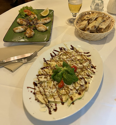 Es gab Calamaris mit Pommes Frites und einem kleinen Vorspeisensalat. Dieser war mediterran gewürzt und schmeckte sehr frisch. Die Calamaris waren ziemlich groß und sahen nicht nach der häufig üblichen TK-Ware aus. Der Knoblauchdip war gut abgeschmeckt.
