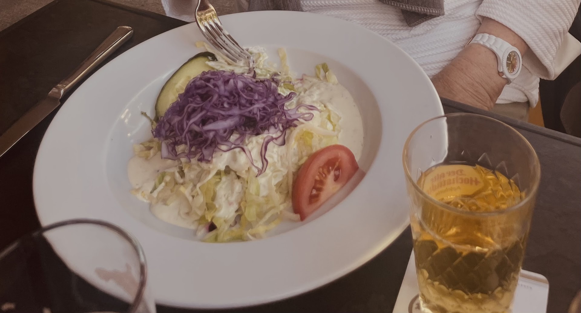 Nach einiger Wartezeit bedingt durch das volle Lokal kam das Essen. Aber die Hauptspeise, das Schweinesteak war trocken, und sehr zäh, so dass ich es ehrlich nicht essen konnte. Ich finde, das kann passieren, zumal die anderen Speisen meiner Begleiter alle lecker waren. Ich ließ das Steak zurück gehen. Der Chef kam persönlich an den Tisch und hat sich dafür entschuldigt. Ich bekam einen Nachtisch aufs Haus angeboten und auch mein Essen wurde von der Rechnung weggenommen.
