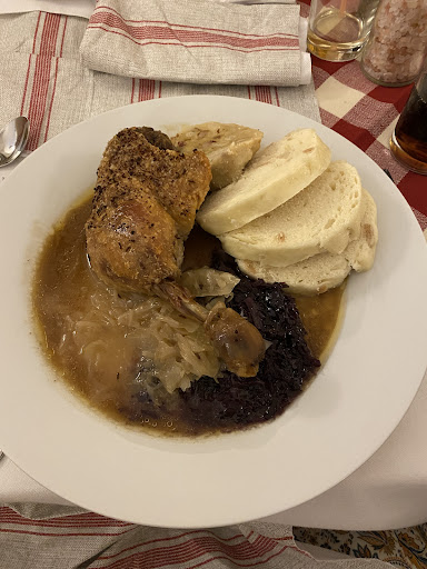 Es handelt sich um eine sehr einladende, urige Gaststätte am Markt von Oberwiesenthal. Die Speisekarte bietet unterschiedliche Speisen, entweder langfristige Angebote oder saisonale Gerichte. Die Zusammenstellung ist betont tschechisch und es schmeckt hervorragend. Ich konnte Entenbrust mit Pflaumensoße probieren, Spätzle mit Bratensoße (von der Kinderkarte) sowie Wildgulasch mit Knödeln, Knoblauchsuppe und Salat der Saison. Überhaupt ist es sehr angenehm, dass es unterschiedliche Gerichte für Kinder gibt, zum Beispiel zwei Sorten Schnitzel (Schwein oder Pute) oder vegetarische Option mit Spätzle. Die Portionen sowohl für Erwachsene als auch Kinder sind gut.