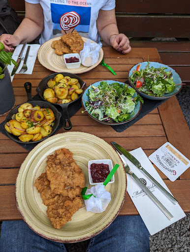 Das Schnitzel war superlecker und da gab es auch nichts auszusetzen, allerdings waren die Bratkartoffeln teils dunkel, teils hatten die den Pfannenboden noch nicht gesehen, verbrannter Speck und Zwiebeln bzw. noch rohe dazwischen, passte irgendwie gar nicht.