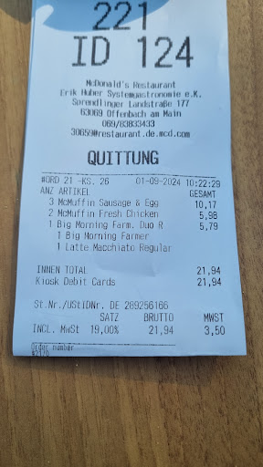 Absolute Katastrophe!!! um 10:22 Frühstück bestellt,um 10:42 endlich geliefert ABER.....siehe Bild..geliefert wurde fälschlicherweise Sausage&Egg ( ohne Egg)...und für den 2ten Sausage& Egg wurde ohne eine Nachfrage einfach ein Bacon& Egg geliefert...wer am Sonntag Morgen gerne Grundsatzdiskussionen führen möchte ist hier genau richtig... ;-)