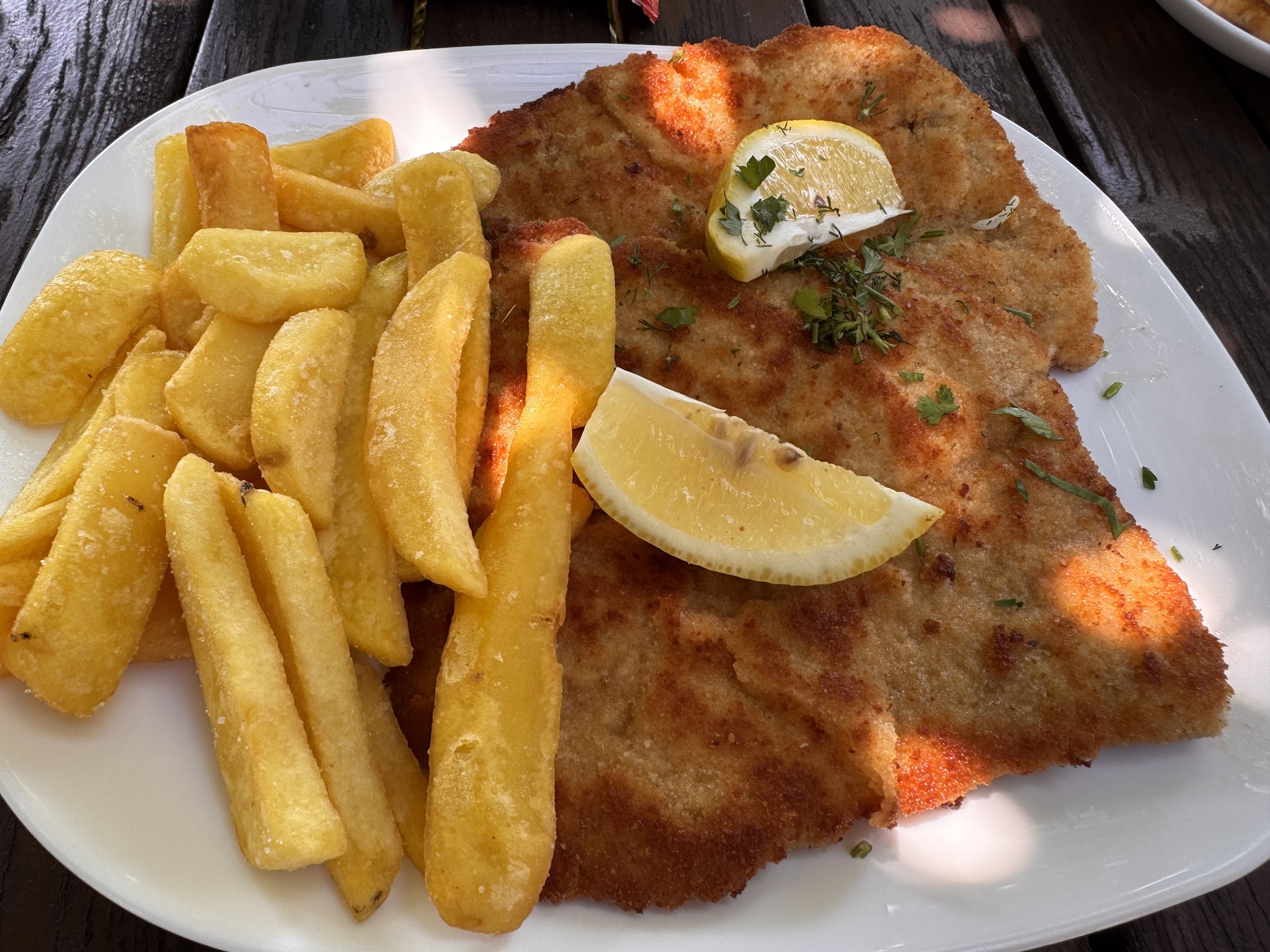 Wir würden draußen an einem Tisch plaziert, der unter Reben war, von denen dauerhaft Unmengen an Pollen/kleinen Blättern fielen. Diese färben die Kleidung und flogen ständig in unsere Getränke.