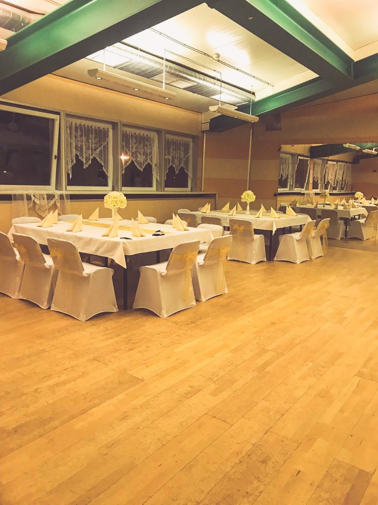 Besonders hervorzuheben ist, wie die Stuhlhussen den Raum verwandeln und die Hochzeit noch schöner machen. Die weißen Hussen verleihen den Stühlen nicht nur eine feierliche Ausstrahlung, sondern sorgen auch für eine harmonische, einheitliche Optik im gesamten Raum. Sie lassen die Einrichtung des Bootshauses in einem eleganten Licht erstrahlen und harmonieren perfekt mit der natürlichen Schönheit des Raumes. Der Kontrast zwischen den modernen Holzelementen, den sanften Farben der Dekoration und den weiß geschmückten Stühlen schafft eine Atmosphäre von Ruhe und Eleganz.