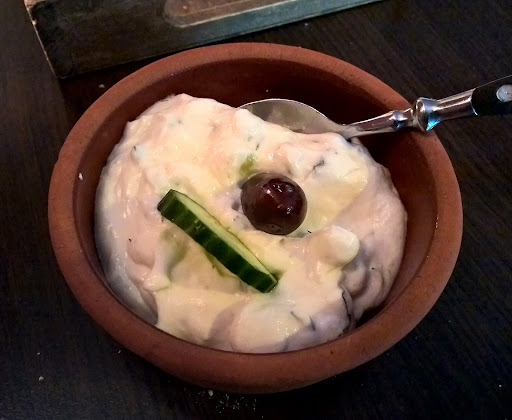 Als Vergleich zum Mykonos hatte ich als Vorspeise auch hier die von mir geliebte Fischrogenpaste Taramosalata, die sich deutlich vom Rezept des anderen Griechen unterscheidet: ist sie dort zitroniger und breiiger, so bereitet der "Taverna Grill" sie äußerst schaumig geschlagen zu, jedoch dem ursprünglichen Geschmack des Rogens vertrauend eher leicht fischig-salzig neutral, ohne viel Zitrone - obwohl eine Zitronenscheibe die Portion zierte (Photo). Geschmackssache ...