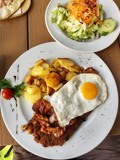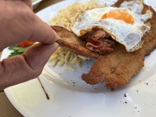 Great German cuisine. It's a little out of the way so good for a cycle ride. It's not so far from an s bahn station (Offenbach Bieber) but might be too far for some to walk. The food was typical for this kind of place. It all seems good and fresh cooked. The one thing i did notice was portion size was not consistent. My partner's schnitzel was double the size of my one. The ordering system takes a little too get used to (order at outside counter then wait for your number to be shouted by megaphone to go pick it up) but food was ready fast. The garden is large and close to nature so you can expect lots of wasps and hornets which didn't sting anybody but might concern some people. The other thing to be aware of with kids is the stream running nearby. It isn't fast and is shallow in places but one of our kids fell in so be careful of you have small kids. They shouldn't be left unattended. The sides of the stream also have lots of nettles which is another rite of passage for...
