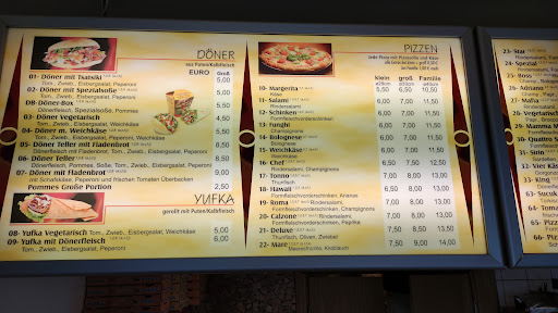 Read moreDas Essen: Na ja... Beim Yufka vom Kollege war ein Langes Haar mit in die Alufolie gewickelt. Der Yufka selbst war auch nicht richtig gerollt und auf beiden Seiten auf. Geschmack nicht gut. Die Pizzas waren OK, nur wie man diese richtig schneidet müssen die noch lernen. Beim der einen Sucuk Pizza war ein riesiges Käsestück (min. 0,5cm dick) 10cm Durchmesser.