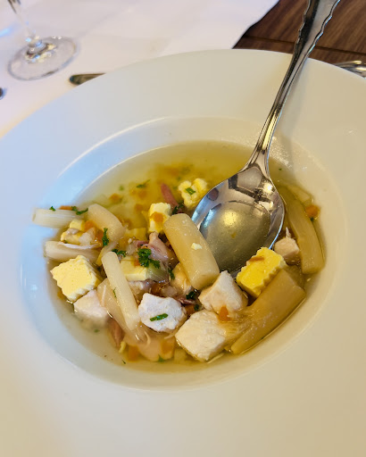There are enough parking spaces. All the staff are very friendly. You are shown to your table and it is beautifully decorated and everything is very harmonious. The menu is very simple and well designed. We had the asparagus cream soup and roulades. The asparagus cream soup was very tasty and had a lot of pieces of asparagus in it. The roulades are simply brilliant. The potatoes and red cabbage are also super tasty. The sauce for the roulades was also very good. We also had a sea buckthorn spritz, which was very good. We will definitely eat here again. For the portion and the quality, you really can pay the money here. Everything is perfect and delicious and we can recommend...