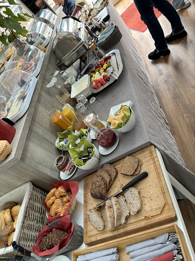 Es gab eine große Auswahl an Brot und Brötchen, an Aufschnitt, Käse und auch Fisch. Dazu auch Mett, Fleischsalat, Säfte, Rührei, Eier, Bacon und kleine Apfel Pancakes. Auch Honig, Marmelade, Nutella frisch geschnittenes Obst und und und.