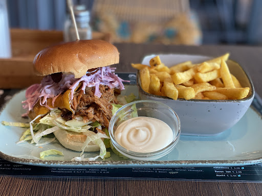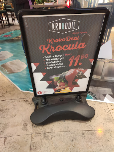 Im Einkaufszentrum Wechloy gibt es einen Food-Bereich, in dem mehrere Anbieter sind. Wir entschieden uns für das Restaurant „Krokodil“, weil das Essen auf den Tellern sehr lecker aussah und mein Mann unbedingt den halben Meter Bratwurst essen wollte. Ich entschied mich für einen Pulled Pork Burger mit Pommes.