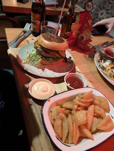 Das Essen war soweit okay... die Portionen entsprechend, das anrichten GUT gemacht. 2x Vegan war gut. Bei den 🍔 Burgern ist der Rand des Brotes SEHR fest...muss man mögen. Die Pizza war Top.
