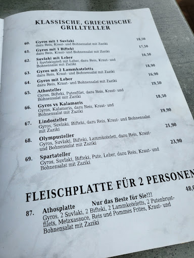 Read moreEs war ein schöner Abend mit Freunden beim "Griechen". Insgesamt ist es im Athos wunderschön angelegt. Den Außenbereich möchten wir gerne bei besserem Wetter mal ausprobieren. Da es schon recht voll war, ist die Geräuschkulisse recht hoch. So ist es eben mit der Personenzahl. Der Service ist familiär und sehr kompetent. Mit viel Einfühlungsvermögen gehen die Angestellten offenherzig auf die Gäste ein und binden die Gäste vollkommen selbstverständlich mit netten Kommentaren in alles mögliche mit ein. Die Bestellungen wurden schnell aufgenommen und das Essen wurde gleichzeitig und ohne Fehler, trotz Sonderwünsche, geliefert. Das Essen war, wie erwartet, reichlich und qualitativ sehr gut. Das kann man einfach und kurz so festhalten. Die spannendste Frage wahrscheinlich: Wie sind die Preise? Ja, es ist teurer geworden. Aber die Kosten sind gestiegen etc. Das kennen wir doch alle zur Genüge. Es lohnt sich aber! Ist doch sonst auch immer interessant zu sehen, dass die Gaststätten so voll sind, wo sich doch alle beschweren wie schwer es doch ist. Ich bin weiter bereit für gute Qualität und Leistung auch zu bezahlen. Auch wenn wir alle...