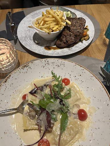 Read moreWir haben hier wirklich sehr lecker gegessen. Das Essen verdient 100 Sterne wenn möglich. Für Feinschmecker ist einiges dabei und man merkt die Liebe zum Detail. Leider bin ich ein Kind der gehobenen Gastronomie… daher war für mich der Service „nur“ ok. In einem gehobenen Restaurant erwarte ich, das man mir die geöffnete Speisekarte in die Hand gibt und nicht einfach alles platt auf den Tisch legt. Sie wie ich erwarte, das man mich fragt ob ich noch etwas trinken möchte wenn mein Glas leer ist und ob ich ein Dessert oder einen Café möchte. Der Tisch an sich war leider katastrophal. Trotz dessen, dass ich vor bereits zwei Monaten für diesen Tag reserviert hatte bekamen wir einen Lounge ähnlichen Platz. Meine mir fremde Sitznachbarin kam mir da bei so nahe wie bei einem Kino Besuch. Mein Mann hingegen, der mir gegenüber saß, war durch den langen Tisch so weit entfernt von mir, dass Jeder in diesem Raum unsere Unterhaltung hätte mit anhören können. Leider war der Tisch auch sehr tief, sodass sogar ich als wirklich kleiner Mensch die Beine nicht übereinander schlagen konnte… das hat die ganze Sache ziemlich unbequem gemacht. Das Essen kam extrem schnell. Meiner Meinung nach zu schnell. Mit Vorspeise und Hauptgericht waren wir genau 45 Minuten beschäftigt. Das hat eher gestresst als das man den Abend hätte genießen können. Das Essen war wie gesagt sehr lecker. Leider bin ich nicht richtig satt geworden da meine Portion wirklich sehr klein war. Ein/Zwei Ravioli mehr hätten niemanden umgebracht. Die Gäste neben mir hatten zufällig das gleiche Gericht wie ich bestellt und hatten wesentlich mehr auf dem Teller. Mein Partner hatte ein Steak Medium bestellt und es kam leider englisch zu uns. Das war aber kein Problem die Kellnerin hat es direkt wieder mitgenommen und noch mal anbraten lassen. Von der Qualität des Essens ein Gedicht. Absolut empfehlenswert und unglaublich lecker. Das genau wird auch der Grund sein, warum wir gerne...